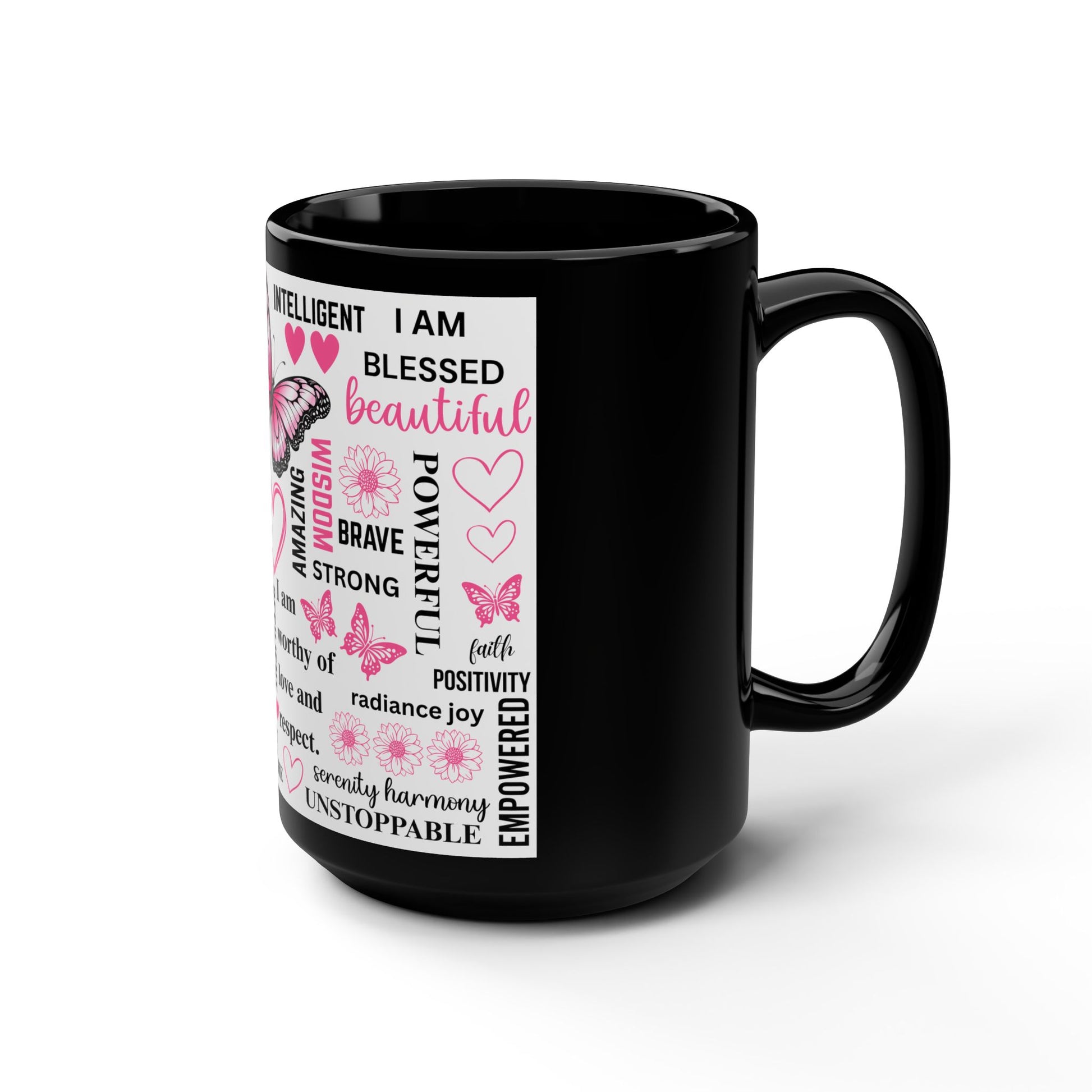 15oz Black Mug — Inspirational Butterfly Affirmation Coffee Cup (I Am... Words of Empowerment)